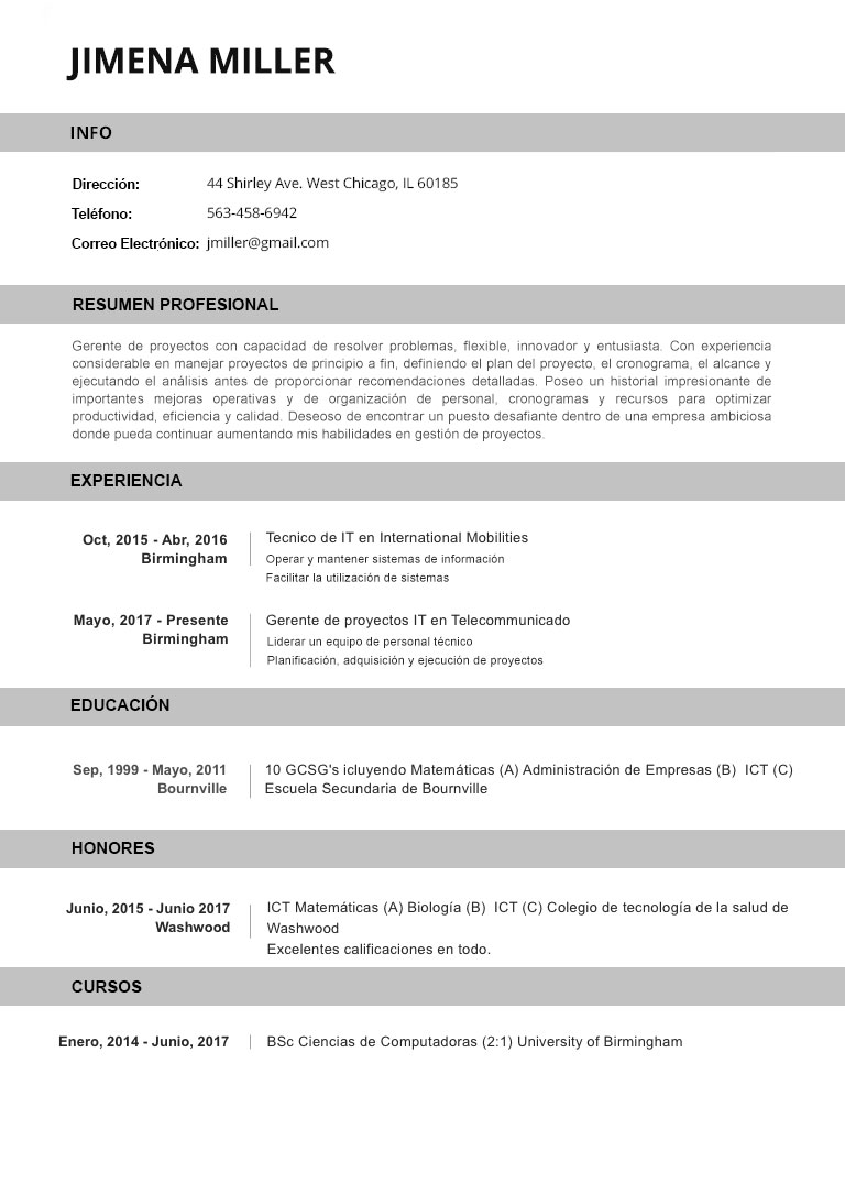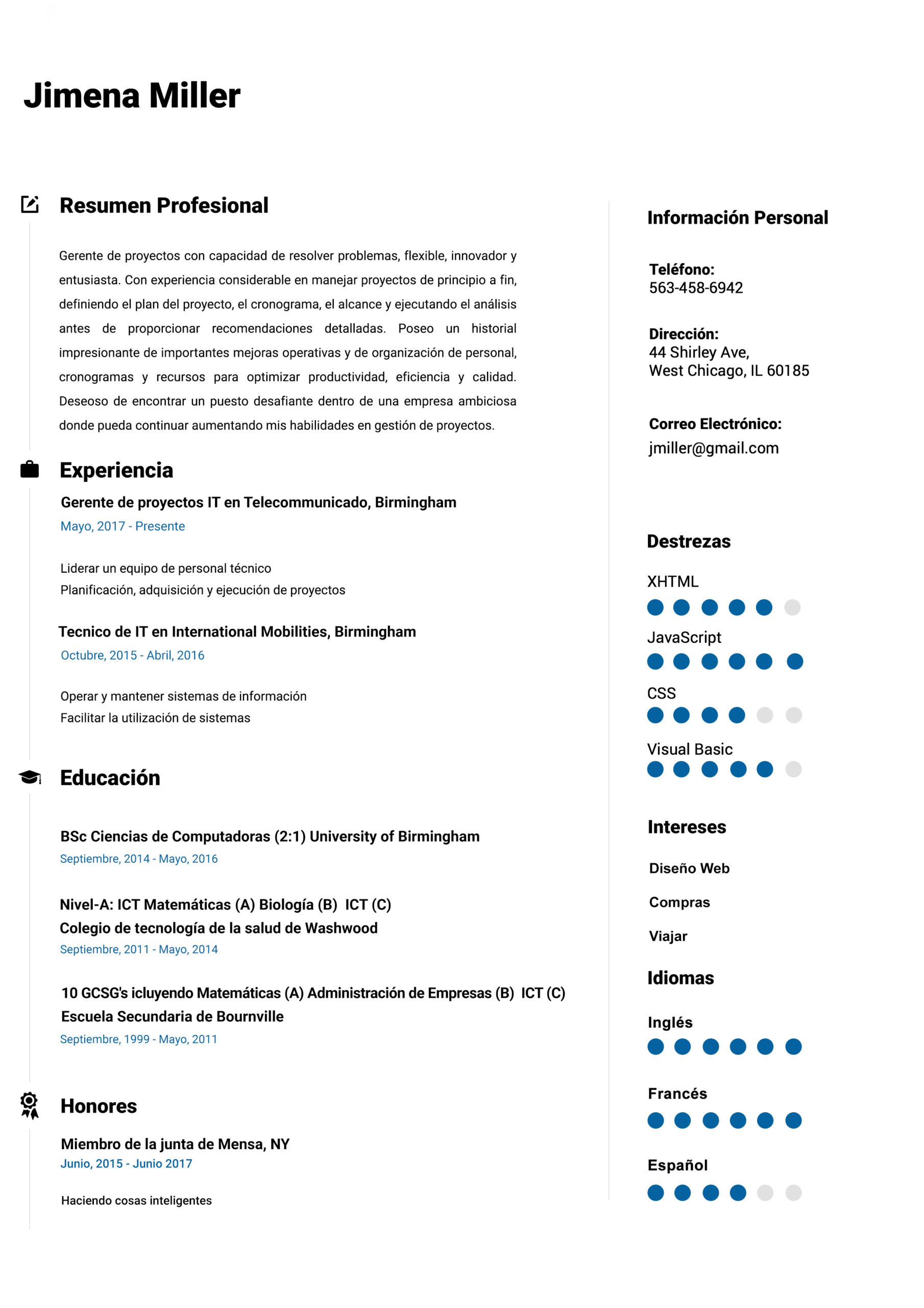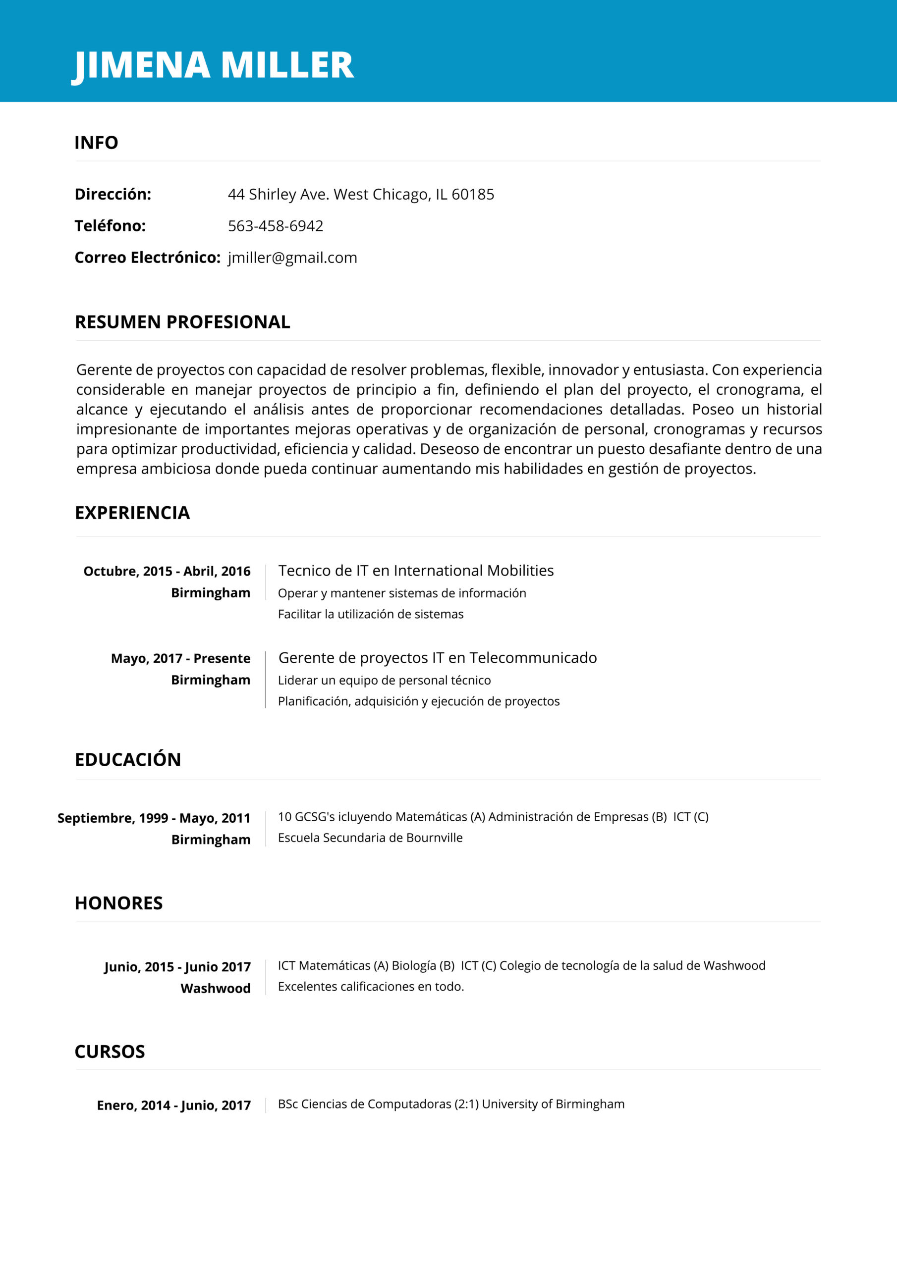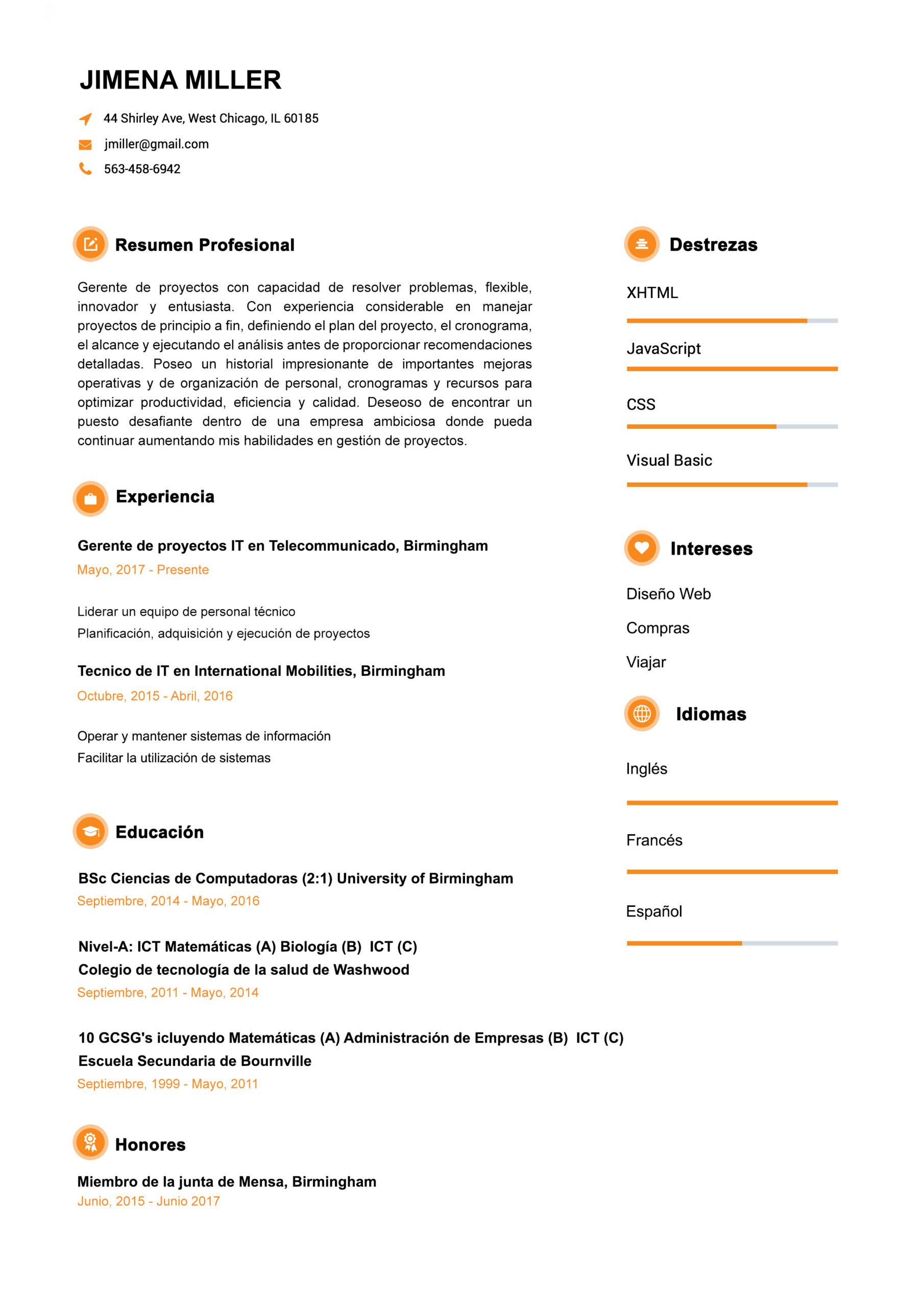 Este formato de currículum hace hincapié en tu experiencia profesional, ya que es la parte de tu currículum en la que suelen estar más interesados los directores de recursos humanos. Formatea tu historial laboral de más a menos reciente, para que los jefes de contratación puedan ver claramente tu progresión profesional. Inteligente, ¿verdad?