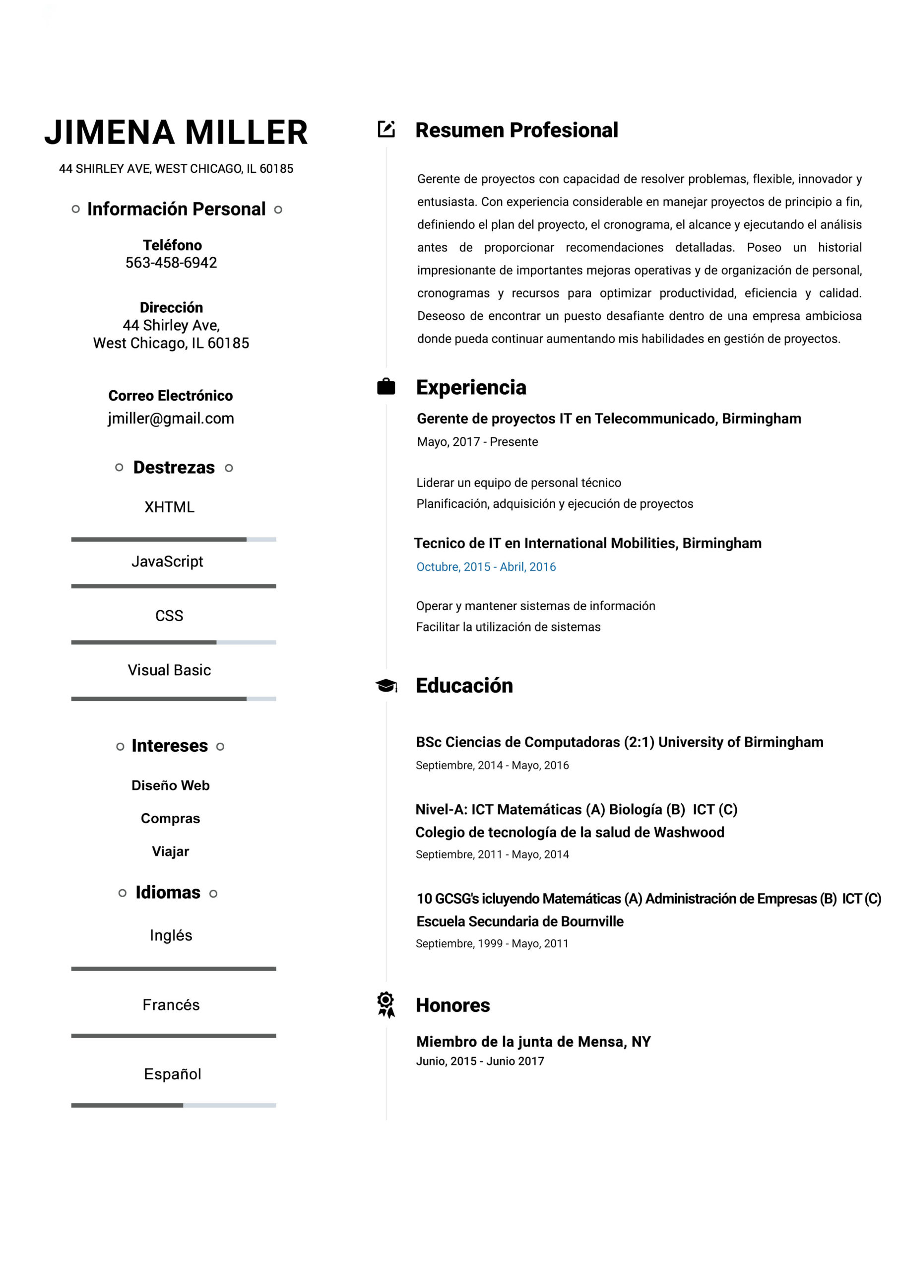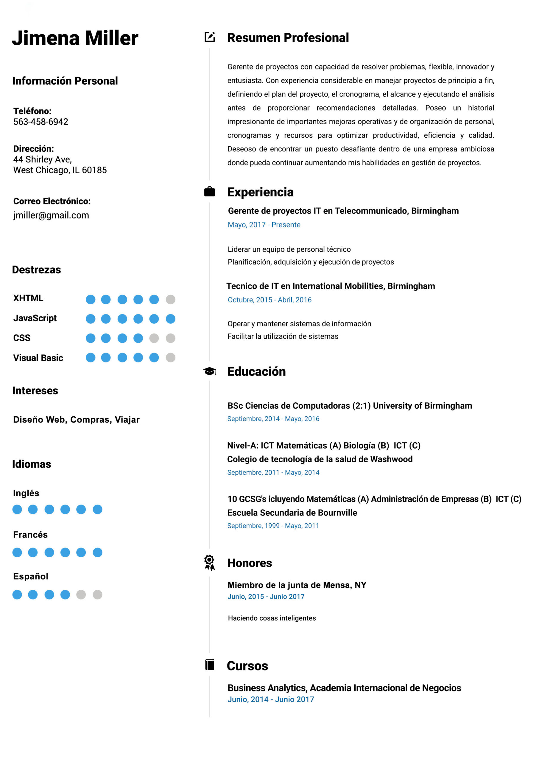 Así que si eres estudiante de secundaria o universidad, deseas solicitar unas prácticas o tienes 10 años o menos de experiencia profesional, un currículum de una página será suficiente. Sin embargo, si llevas trabajando 10 años o más, puedes añadir una página por cada década que lleves en el mundo laboral. Consulta nuestros ejemplos de currículum para hacerte una mejor idea de la extensión que debe tener tu currículum