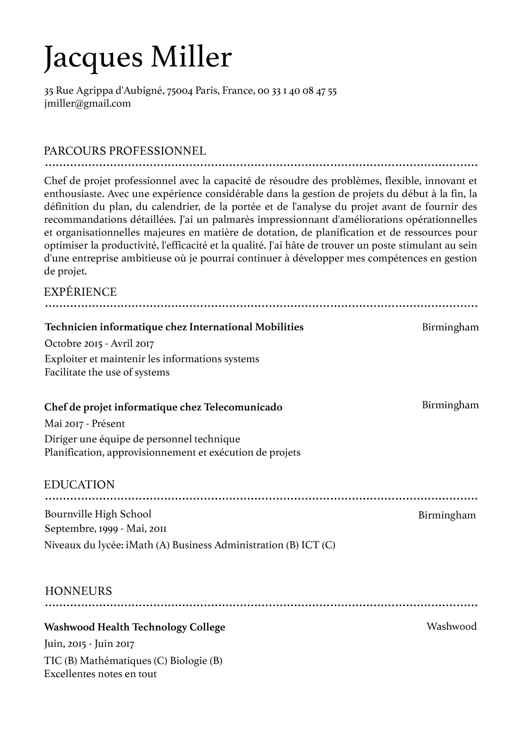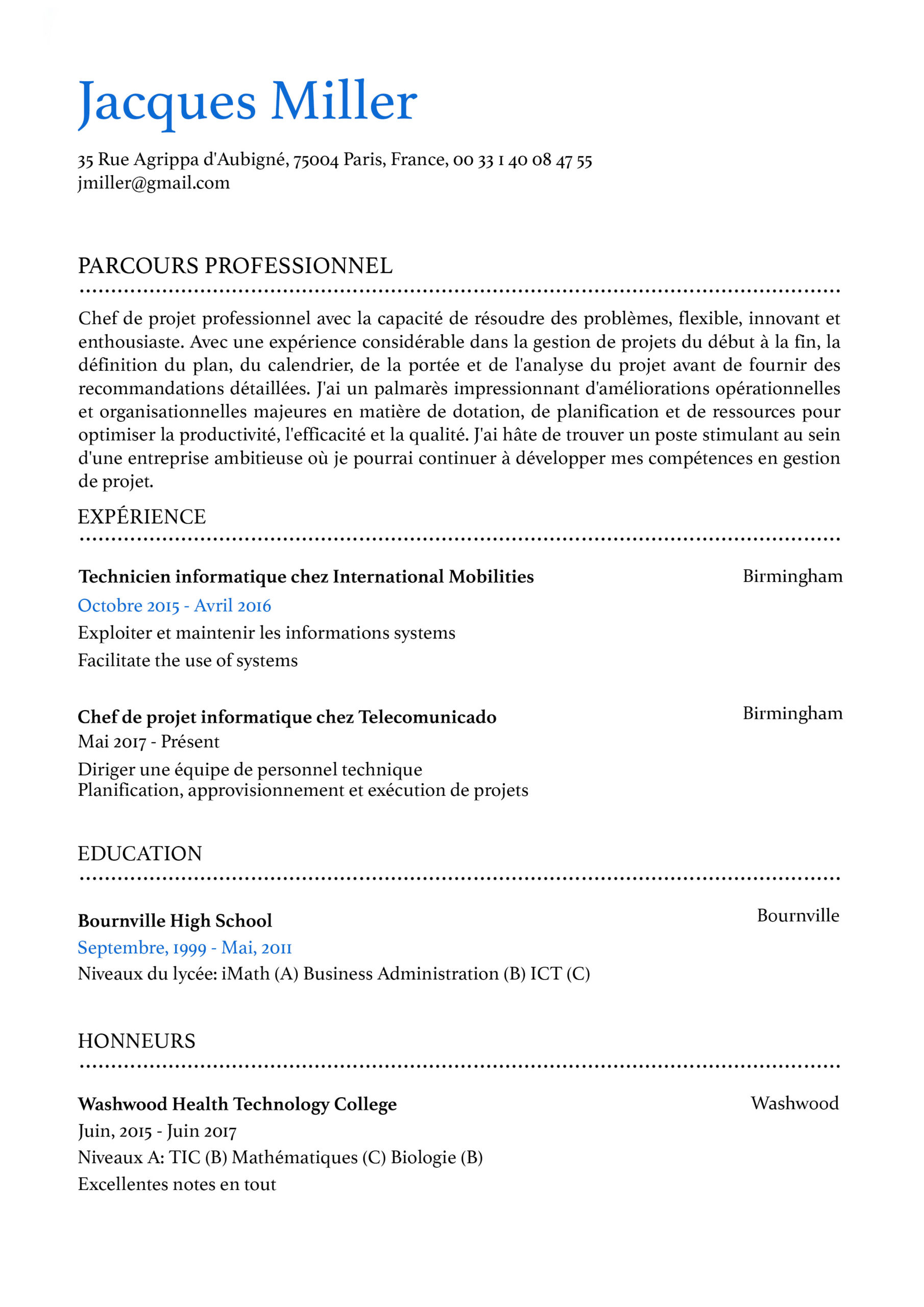 Comme indiqué ci-dessus, il s'agit du format le plus populaire, le meilleur et le plus complet pour la plupart des candidats à un emploi. Il répertorie votre expérience professionnelle en commençant par votre emploi le plus récent en haut et détaille vos accomplissements dans chaque rôle. C'est le choix idéal si vous avez eu un emploi continu dans votre secteur au fil du temps et que vous souhaitez donc vous concentrer en grande partie sur ces antécédents professionnels.